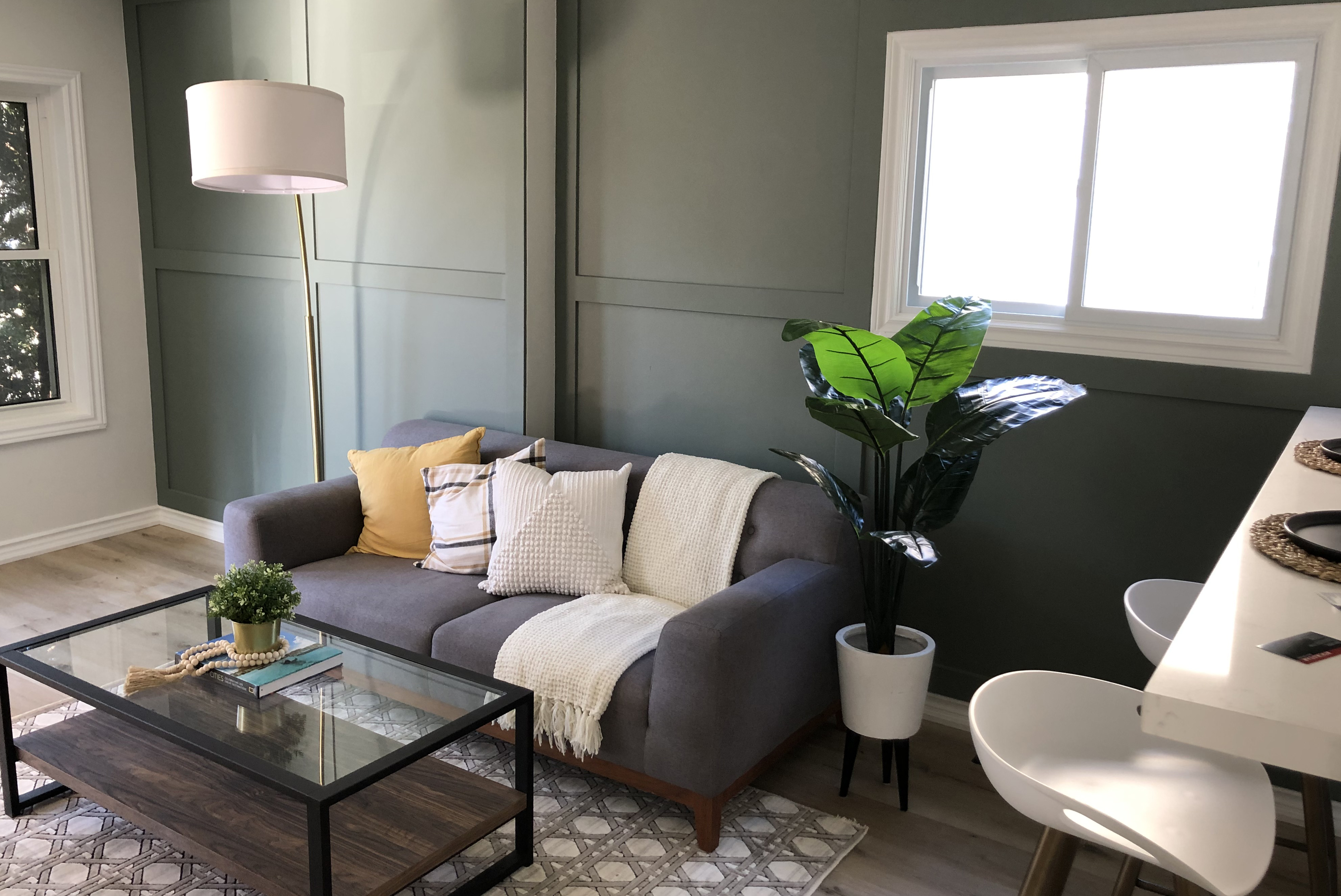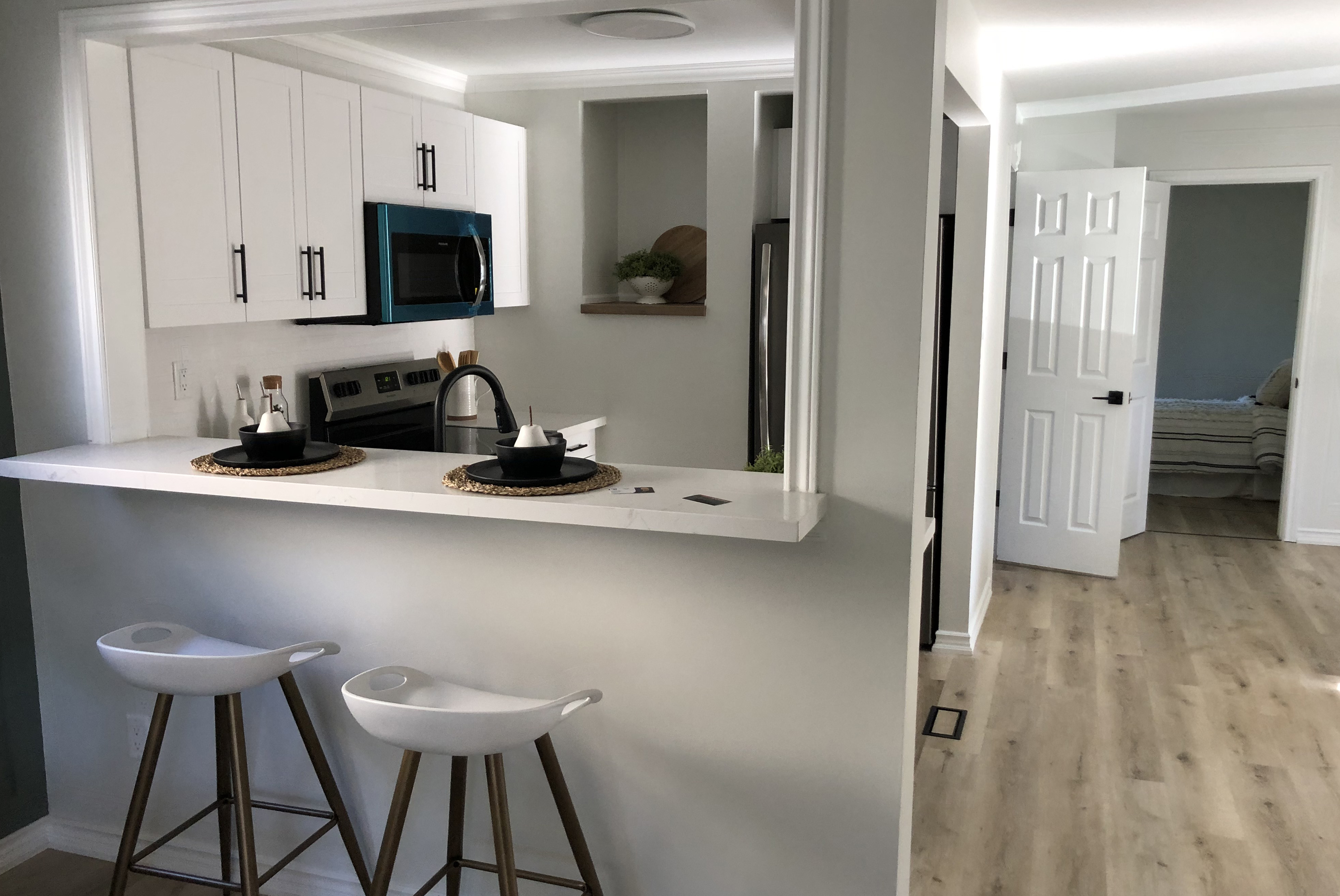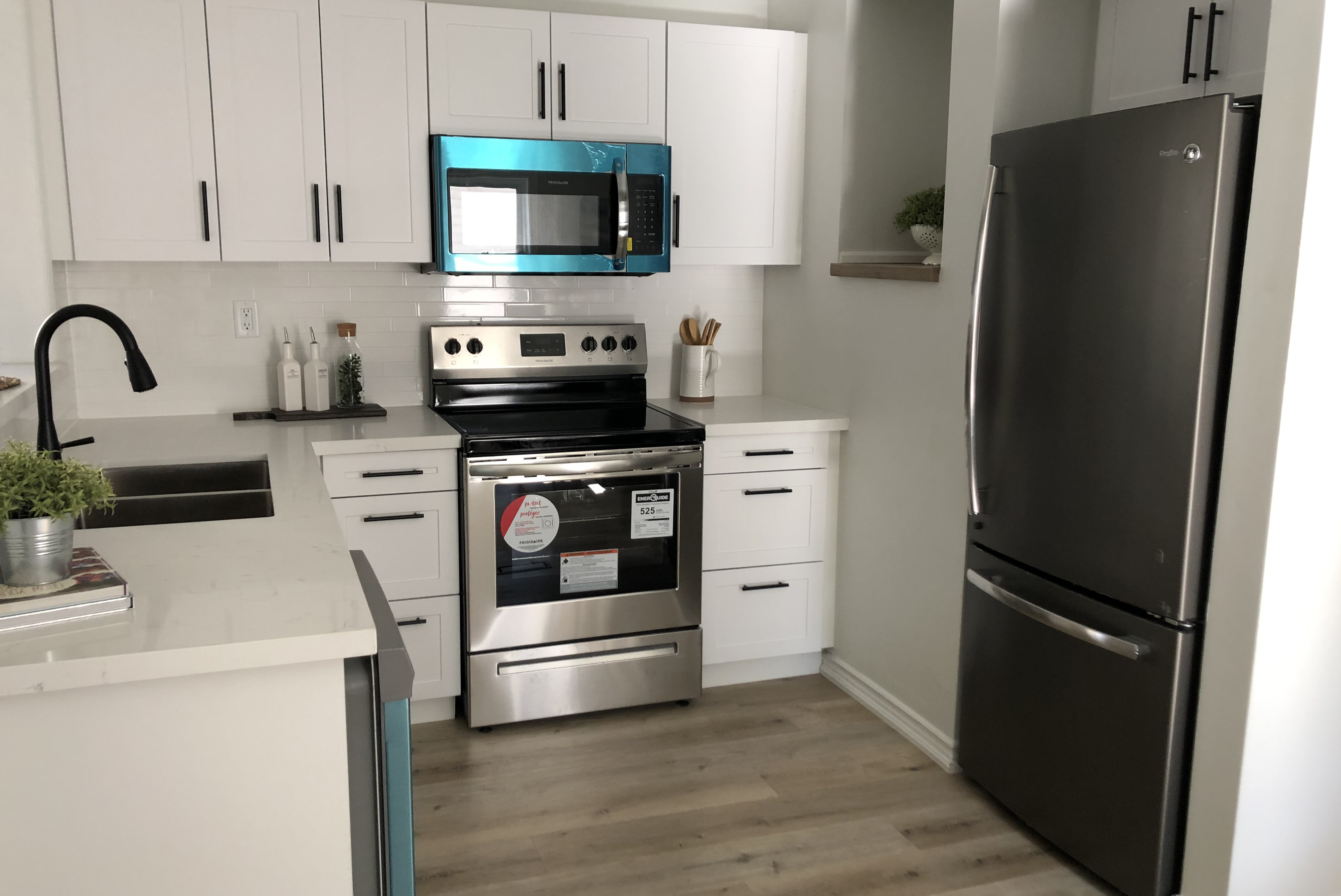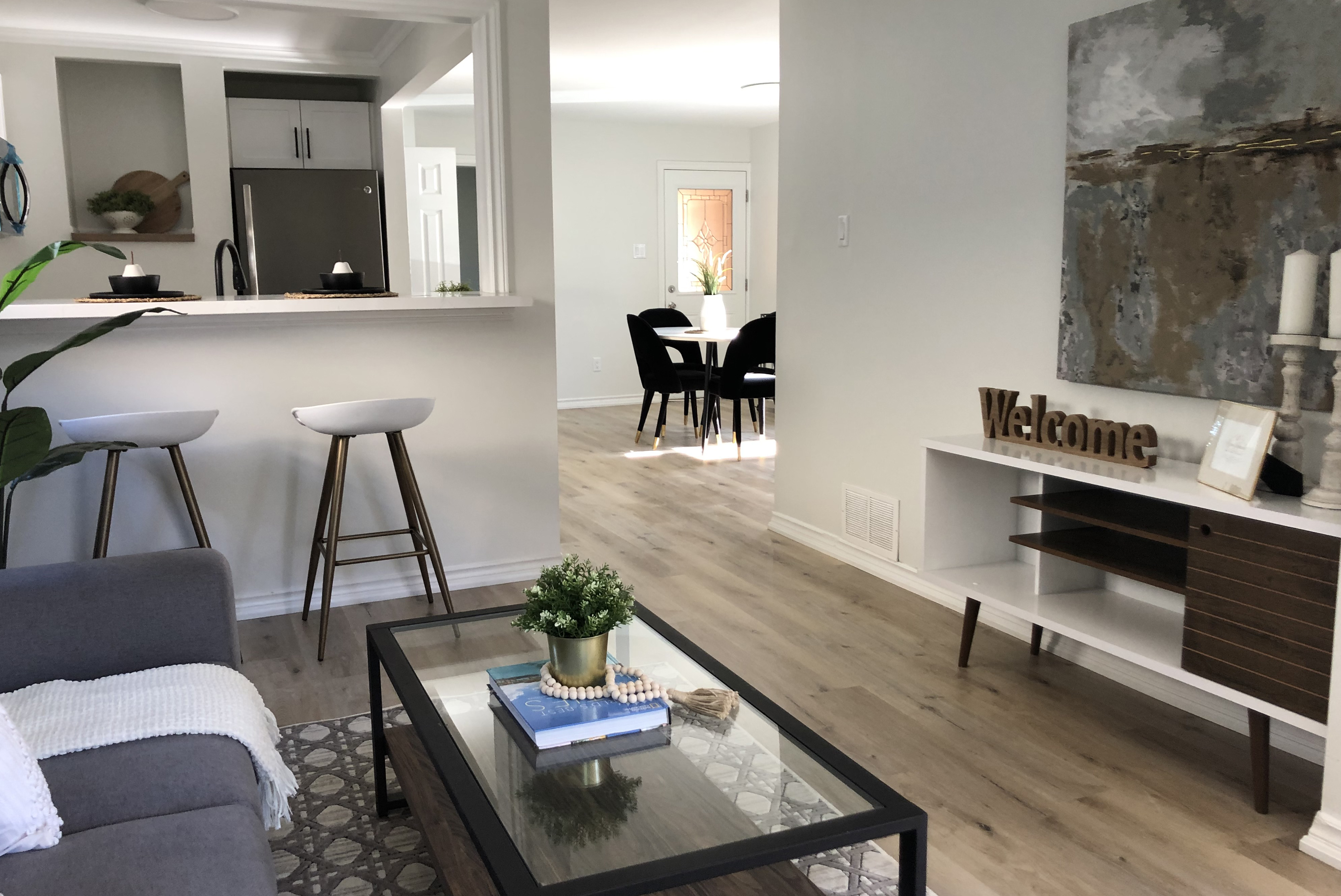 Lextra Renovations is proud to showcase our latest design and home remodelling project—a bright and modern house got a new facelift with some unique details, such as new floors on the entryway, in the living room, kitchen and master bedroom to match the new modern kitchen cabinets with quartz countertops created the perfect balance in this open space design.